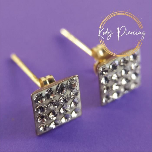 KODY PIERCING Boucles d’Oreilles – Or 9 Carats & Carré de Zircons CZ | Éclat Raffiné