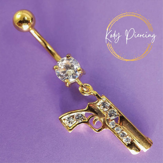 KODY PIERCING Bijou de Nombril Pistolet Colt Plaqué Or incrusté de Zirconium 10mm